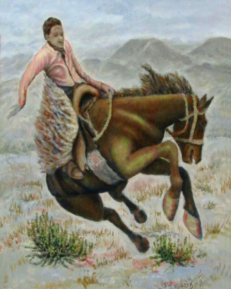 This wild bronco ride was captured on film in 1932 in Pinedale, Wyoming. It was Bump Boedeker riding. He was the father of a friend who is now deceased. By the late 1950s, the photo was know in that area to be one of the best dynamic photos of all time, showing a man breaking a bronc. This wonderful, one-of-a-kind painting was created on archival hardboard in 2008. The painting is 18″ x 24.” The frame is 28″ x 34.” It truly is a pleasure to view. I especially am fond of it because I use to break and train horses in Dubois, Wyoming when my friend was the cook on the Red Rock Ranch.