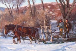 This wild bronco ride was captured on film in 1932 in Pinedale, Wyoming. It was Bump Boedeker riding. He was the father of a friend who is now deceased. By the late 1950s, the photo was know in that area to be one of the best dynamic photos of all time, showing a man breaking a bronc. This wonderful, one-of-a-kind painting was created on archival hardboard in 2008. The painting is 18″ x 24.” The frame is 28″ x 34.” It truly is a pleasure to view. I especially am fond of it because I use to break and train horses in Dubois, Wyoming when my friend was the cook on the Red Rock Ranch.