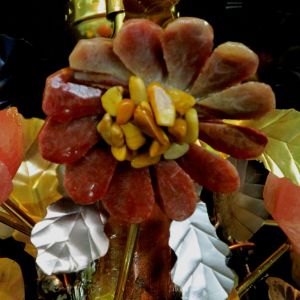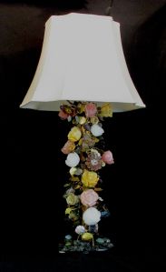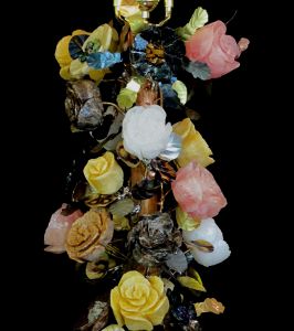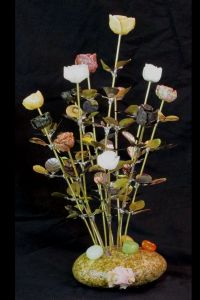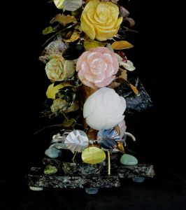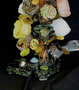 The Rose, Daisy, and Impatient blossoms were carved by hand under water using diamond tools. The stems and leaves were hand-cut and formed from treated quality steel and brass and the entire sculpture is held together with high-tech permanent fixative, solder, and standard brass lamp parts. The entire composition is coated with crystal clear acrylic to protect from stains and to bring out the beautiful natural color of the stones.