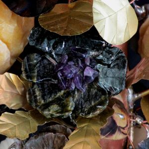 The hand crafted leaves and stems are Brass and Steel. The entire composition is held together with high-tech permanent glue and is coated with Crystal Clear Acrylic to protect from stains and to bring out the beautiful natural colors of the stones.