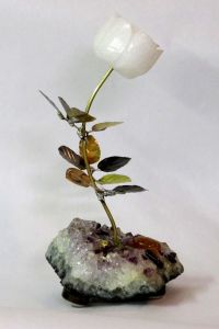 Snow White Quartz Rose Stone Sculpture on Amethyst Geode With Gemstones